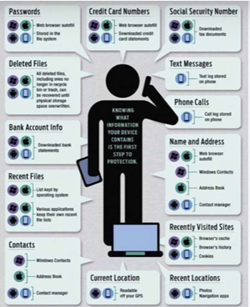 Come difendersi e quale atteggiamento adottare dunque? Innanzitutto è importante adottare un corretto cybersecurity mindset. Cioè comprendere cosa esattamente contengono i nostri device in termini di dati sensibili. Nella figura che abbiamo allegato sono riportati tutti i dati che vengono registrati dei nostri device... quanto ne siete consapevoli? A volte sembra alla moda eseguire un pagamento con il cellulare o “avere tutto alla portata di un click” ma, se le cose dovessero andare male, quanto ci costerebbe?